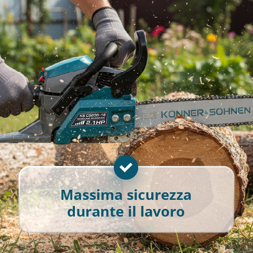 • Sécurité maximale lors du travail – le frein à inertie de la chaîne arrête instantanément la chaîne en cas de rebond, réduisant le risque de blessure et permettant de travailler en toute confiance, même sous forte charge.