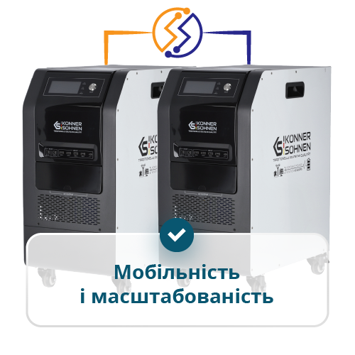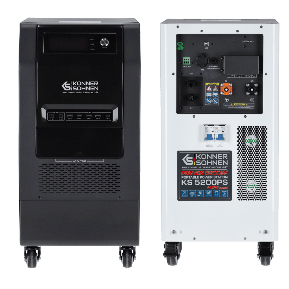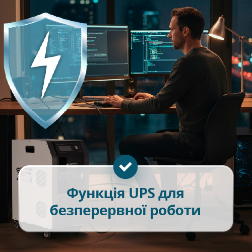 Вихід 48V DC для генератора або АКБ, Інвертор із “чистою” синусоїдою, LiFePO₄ 5,12 кВт⋅год, MPPT-контролер, UPS < 10 мс, Підтримка Tandem Power, Швидке заряджання до 80 % за 1 год, Захист від перевантаження та перегріву, РК-дисплей з моніторингом параметрів, Колеса та ручки для пересування |